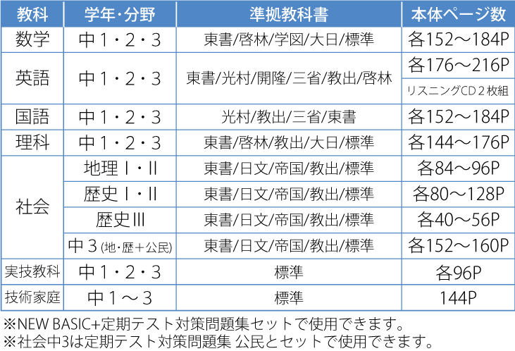 全学年主要5教科にて、ほぼ全ての教科書に対応したラインナップを揃えています。また、実技4教科(音楽・美術・保健体育/技術家庭)もラインナップ、定期テスト対策に活用できます。