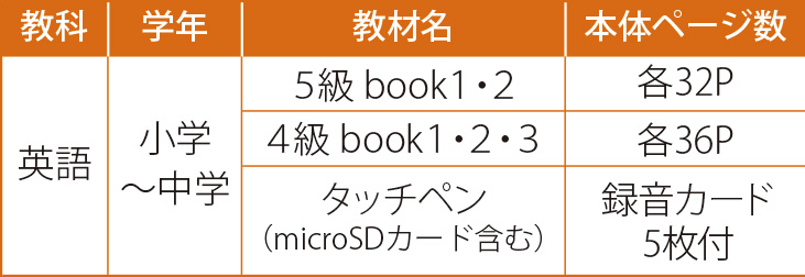 • 「あい・キャン英語」と同様にタッチペンを使用して学習する教材です。タッチペンで音声を再生し、容易に英語の発声練習やリスニング対策が行えます。