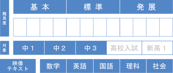 • 中学1年生~3年生の英語・数学・国語・理科・社会における各単元の「基本」を、映像授業と専用教材で分かりやすく学習できるコンテンツです。個別指導・集団指導・家庭学習など、様々な学習形態にご活用いただけます。