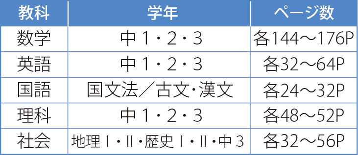 ※中1(英・数・理・地理Ⅰ)、中2(英・数・理・地理Ⅱ)、中3(英・数・理・社)については、新学習指導要領の対応資料が挟み込まれています。