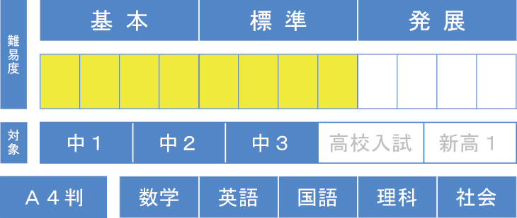 • 暗記すべき内容やオーソドックスな問題、頻出問題に取り組み、単元学習の復習や反復演習を行います。単元にぴったり対応した基礎~標準レベルの問題で構成しているので、各単元で学んだ教科書内容がしっかりと定着でき、家庭学習の習慣も身につきます。