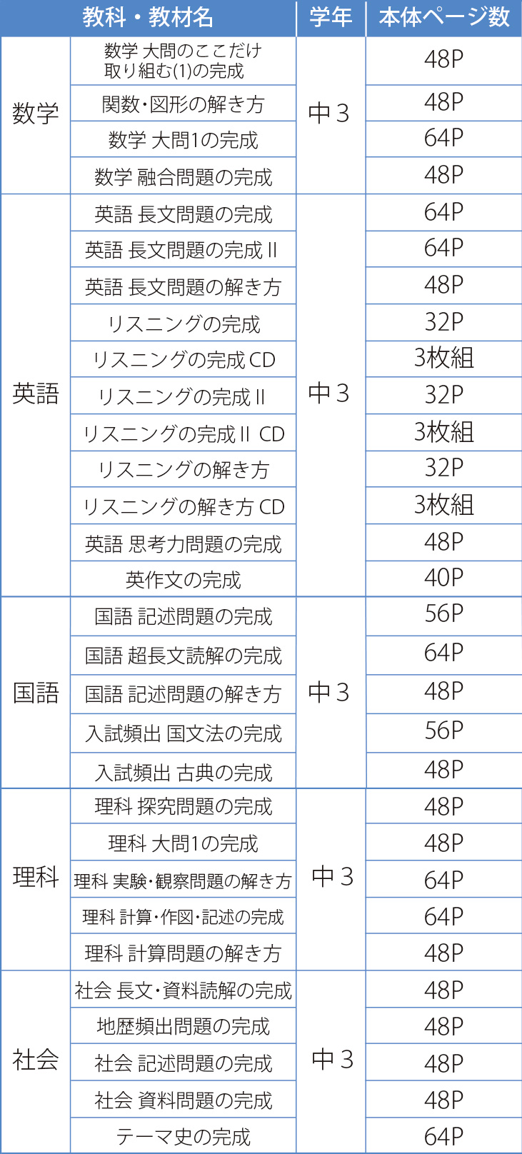 各教科、入試で特に高い配点で出題される分野・出題形式に特化して対策できる教材をそれぞれ発刊しています。特にご好評いただいている英語の「長文読解」、「リスニング」、国語の「記述問題」は複数冊のラインナップで、十分な対策が可能です。