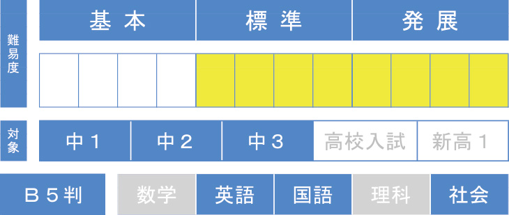 1・2年用は、「教科書レベル→教科書応用〜入試レベル→入試レベル」3年用は「公立入試レベル→私立中位レベル→国・私立難関レベル」と、効果的なレベル設定になっているため能力別クラス編成にこの一冊で対応可能です。