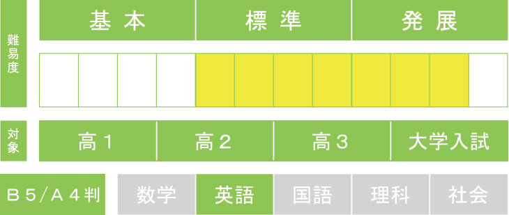大学入試で頻出の文法事項を、例文と演習問題を中心に扱ったシリーズです。「Ⅰ・Ⅱ」は中堅~MARCHレベル、「Ⅲ」は難関大を視野に入れた内容で、志望校に応じた柔軟な使い分けが可能です。