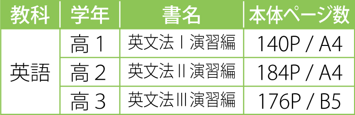 教室の授業での使用を意識した構成で、文法解説は教師用指導書のみに収録しています。テキストには問題演習を充実させ、授業への集中を促す設計となっています。