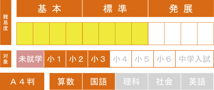 アメリカの幼稚園の学習カリキュラムを基盤に、かずの導入からたしざん・ひきざん・かたちなどの問題で構成、算数学習をはじめる前の導入教材です。