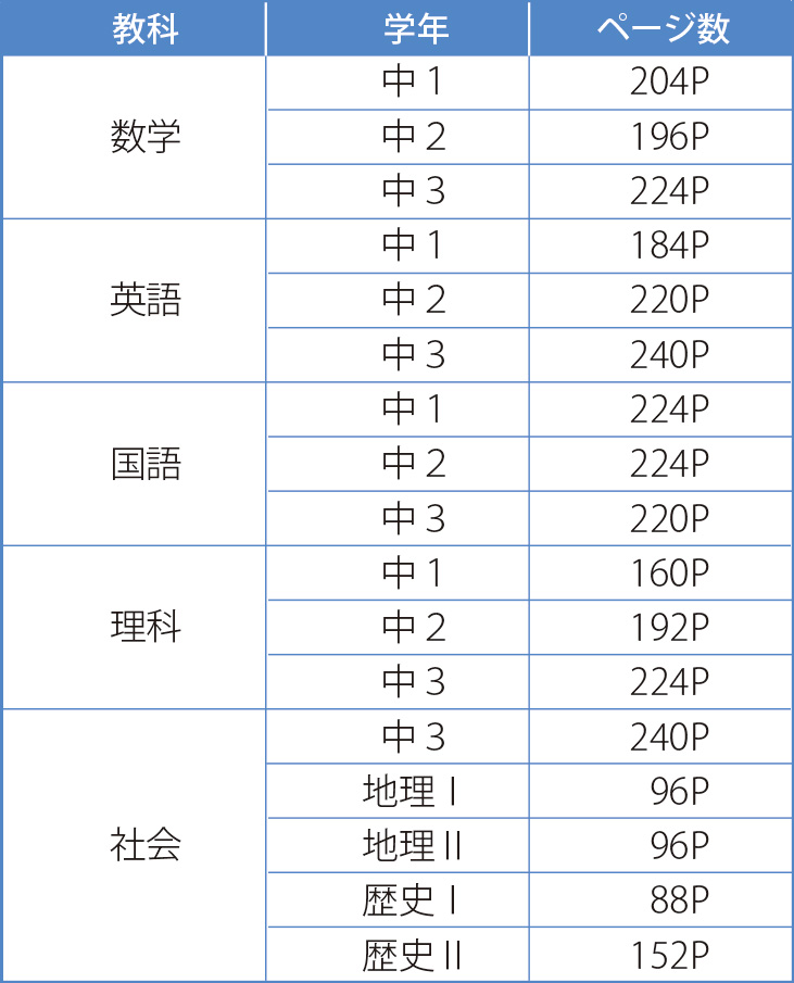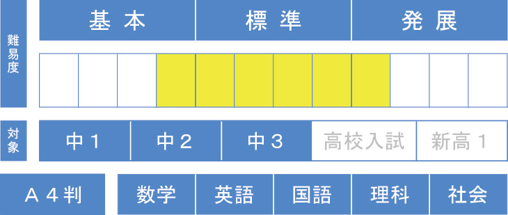 • 中3用は、中1・2内容の総整理に加え、「入試対策」を前面に押し出した内容で構成。入試に向けた基礎力の定着と、実戦的なトレーニングを行うことができます。