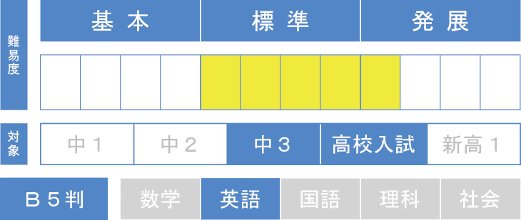 公立入試で増えつつあるビジュアル英文を「地図」「イラスト」「広告」「統計・表」「グラフ」に5分類。問われるポイントをパターン別に整理し、効率よく解き進める力を身につけます。中学内容を一通り学習した中3の夏以降、問題ごとに設定されている目標時間を目安に、入試本番を意識しながら学習を進めていただくと効果的です。